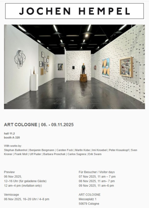 Originally founded in 1967 by the gallery owners Hein Stünke and Rudolf Zwirner as the 'Kunstmarkt Köln '67', ART COLOGNE is today one of the most important international addresses for exceptional and high quality art of the 20th and 21st centuries. Around 200 leading international galleries from more than 20 countries come together annually and present a broad offering of modern and contemporary works in all price segments and movements by more than 2,000 artists. Presented by Jochen Hempel Gallery